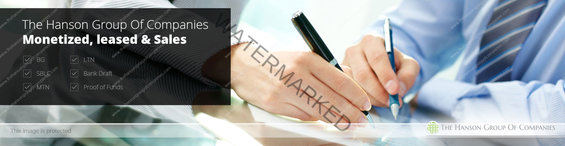 The Hanson Group focuses on utilizing many financial instruments in assisting you to reach your economic goals. We incorporate SBLC, BG, LTN, MTN, KTT, SKR, POF, Bank Draft, Block Funds, Bank Instrument Monetization, Offshore Bank Account Openings, Leasing and Selling Financial Instruments, Project Funding, Recourse and Non-Recourse Loan, Paymaster, Escrow and Commission Dispersal Services.